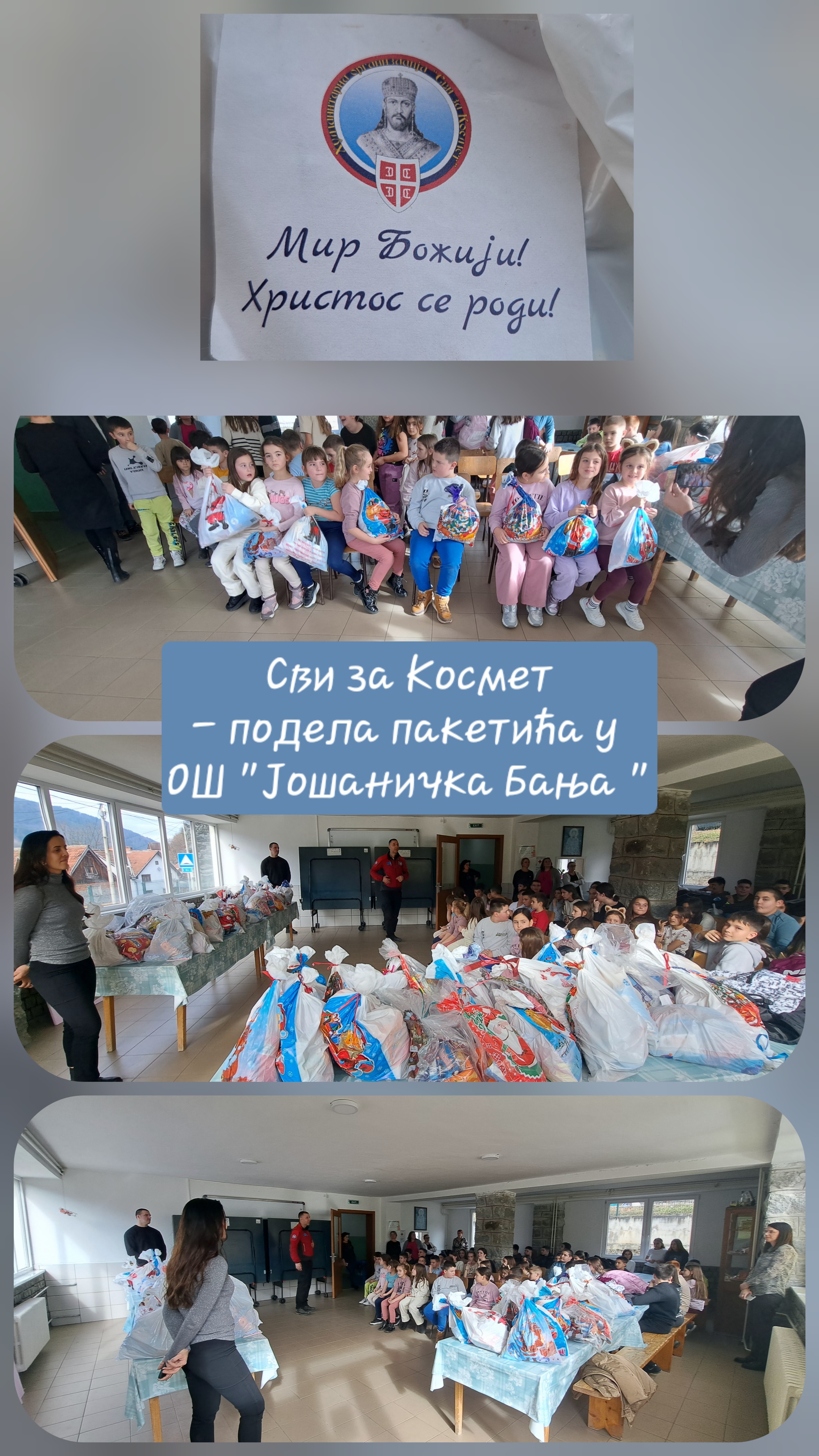 By ОШ Јошаничка Бања28/01/2026Вести Хуманитарна организација „Срби за Србе“ и ове године је поклонила свим ученицима ОШ ,,Јошаничка Бања“ светосавске пакетиће 28. јануара 2026. године. Захваљујемо на посети, дружењу и поклонима!